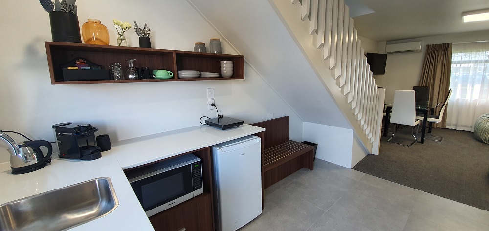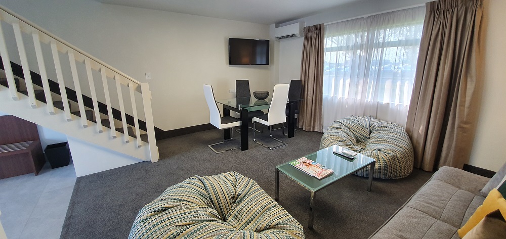 Our Family Suites have a separate lounge/dining area, and kitchenette. Upstairs, there are 2 luxuriously appointed bedrooms, 1 bedroom with 1 King bed and 1 bedroom with 2 Single beds. Kids get their own bedroom, whilst parents can enjoy the privacy of their own space to stretch out in. For babies we offer a baby bath and baby cots can be supplied on request at no extra cost.